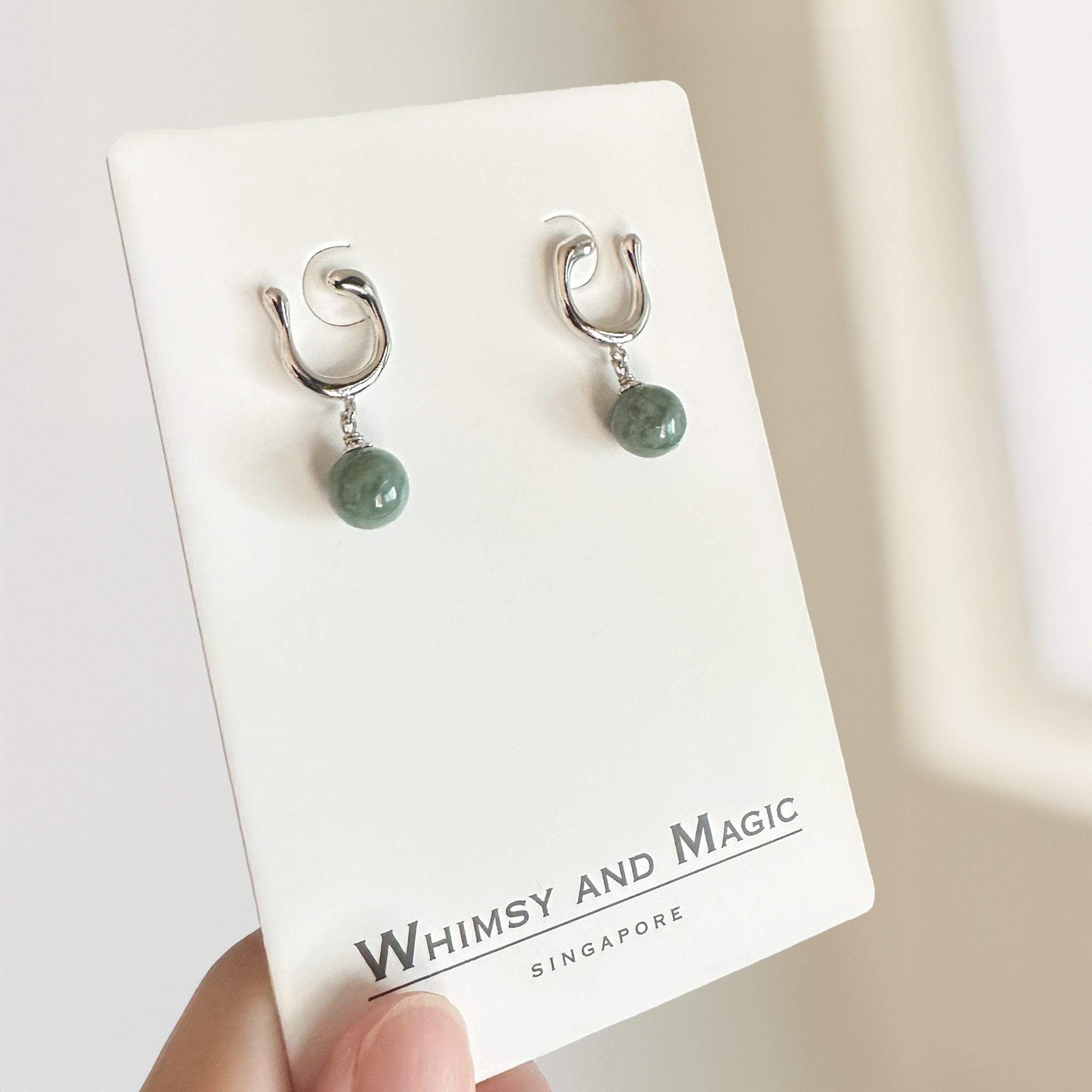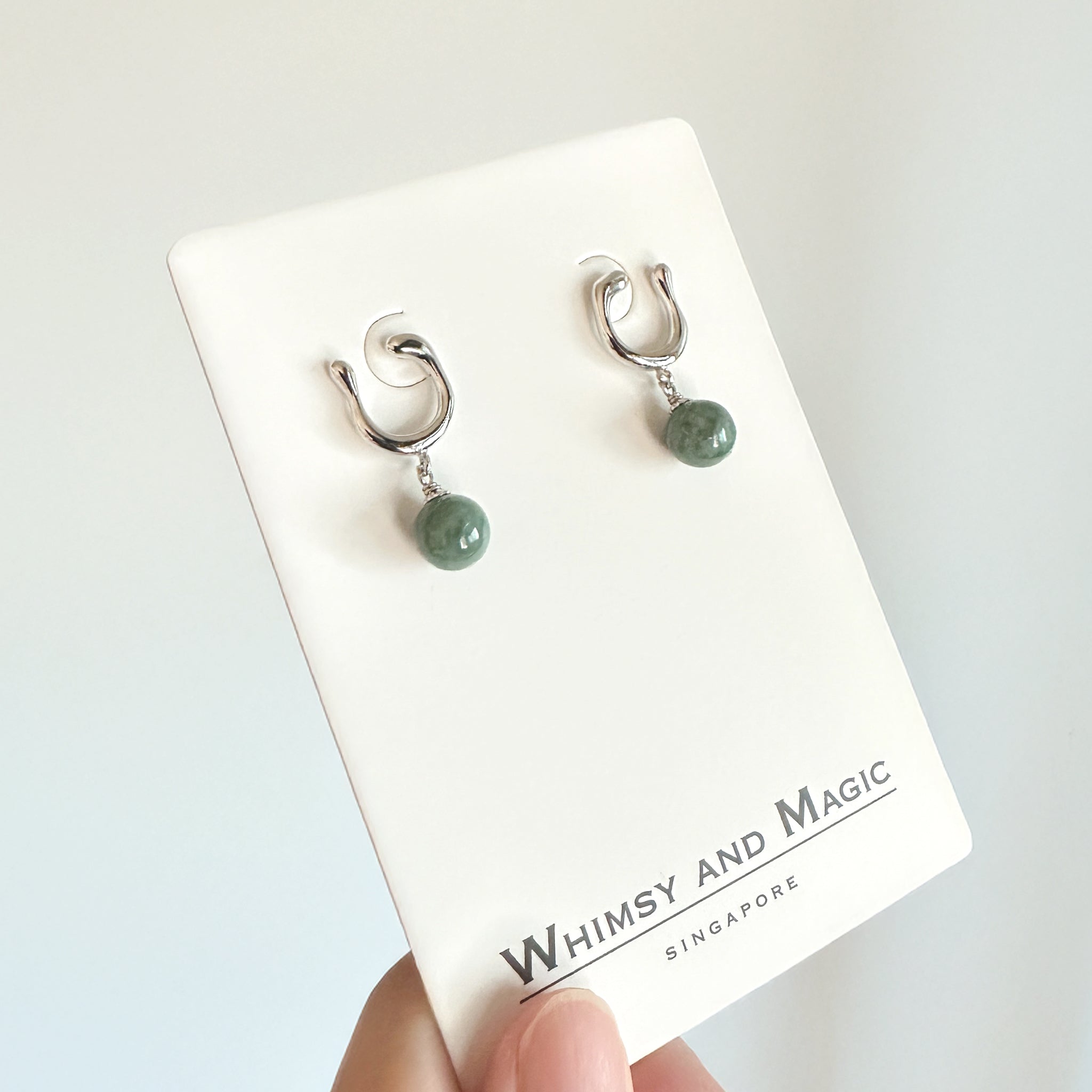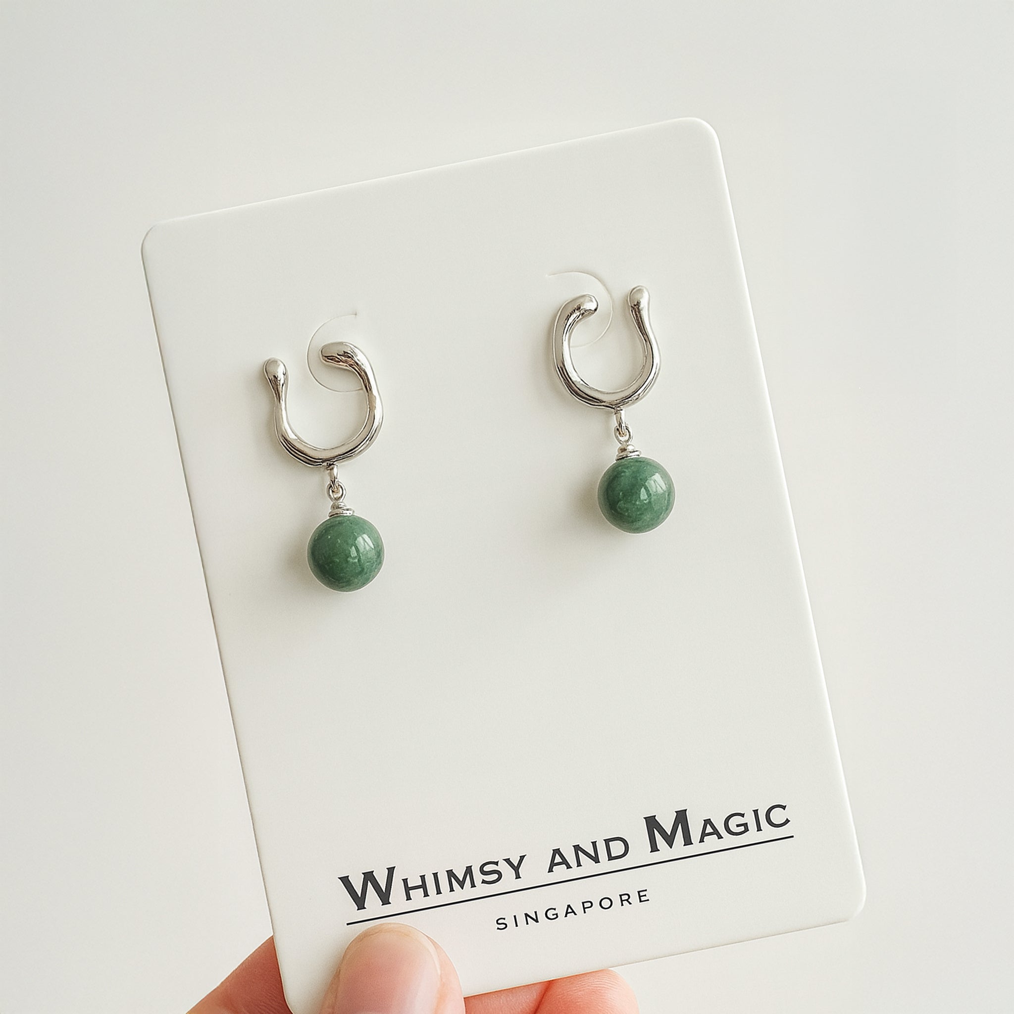 Verdant Loop is a refined take on organic balance. A polished green jade bead rests beneath a softly curved silver hoop, forming a design that feels fluid, understated, and naturally composed.